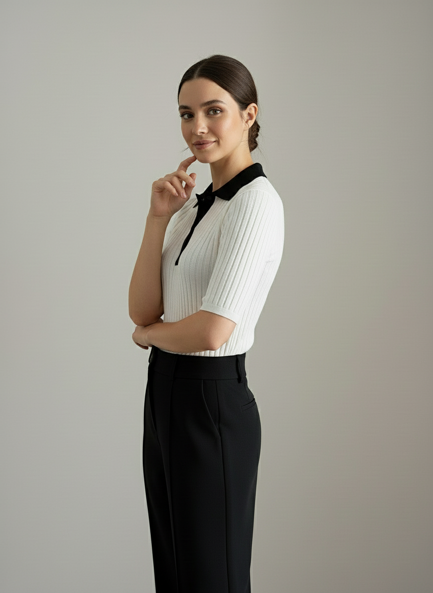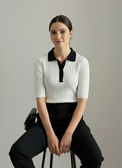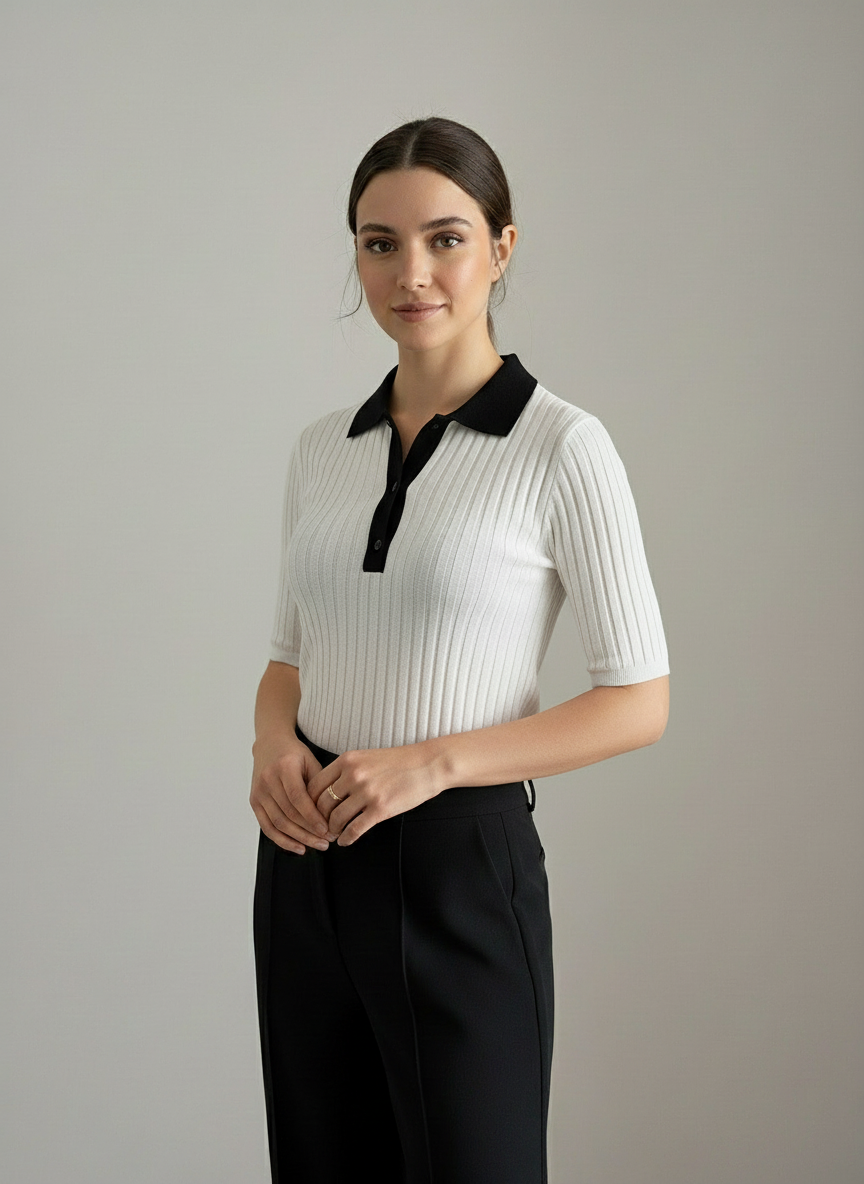 Luce un estilo sofisticado y moderno con nuestro polo tipo canalé en color beige, diseñado para ajustarse al cuerpo y estilizar la figura. El cuello y la tapeta en contraste negro aportan un toque elegante y distintivo, mientras que el tejido canalé garantiza comodidad y un ajuste perfecto. Ideal para crear looks versátiles, desde casuales hasta más arreglados, este polo resalta la silueta y aporta un acabado refinado a cualquier outfit.