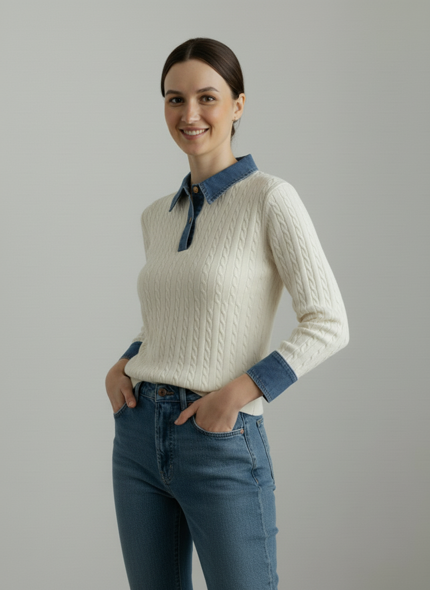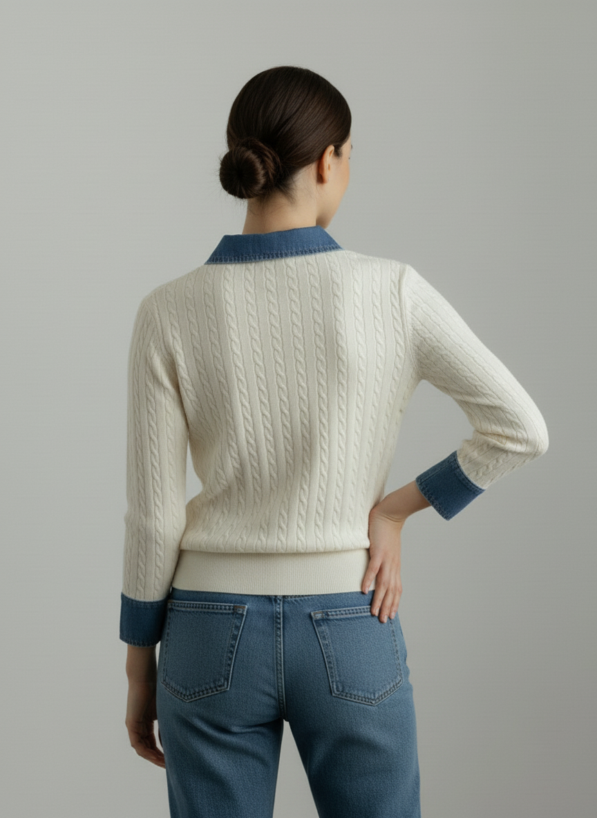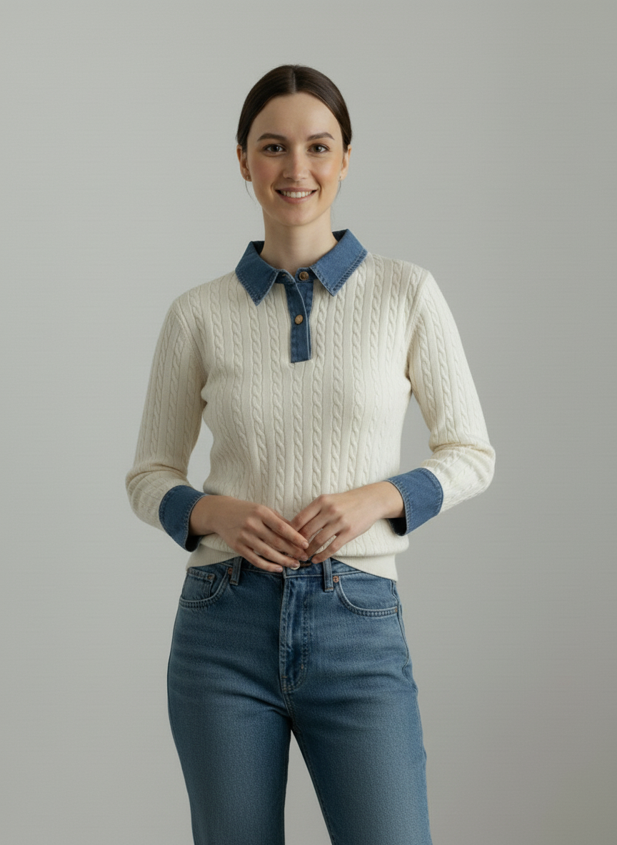 Combina comodidad y estilo con el sweater Denim Contrast, confeccionado en punto trenzado en color crudo que aporta calidez y textura. Su diseño incluye cuello y puños en denim, junto a una tapeta con botones en contraste que añade un toque casual y moderno. Perfecto para combinar con jeans, faldas o pantalones, se convierte en una prenda versátil y sofisticada para looks de diario o entretiempo.