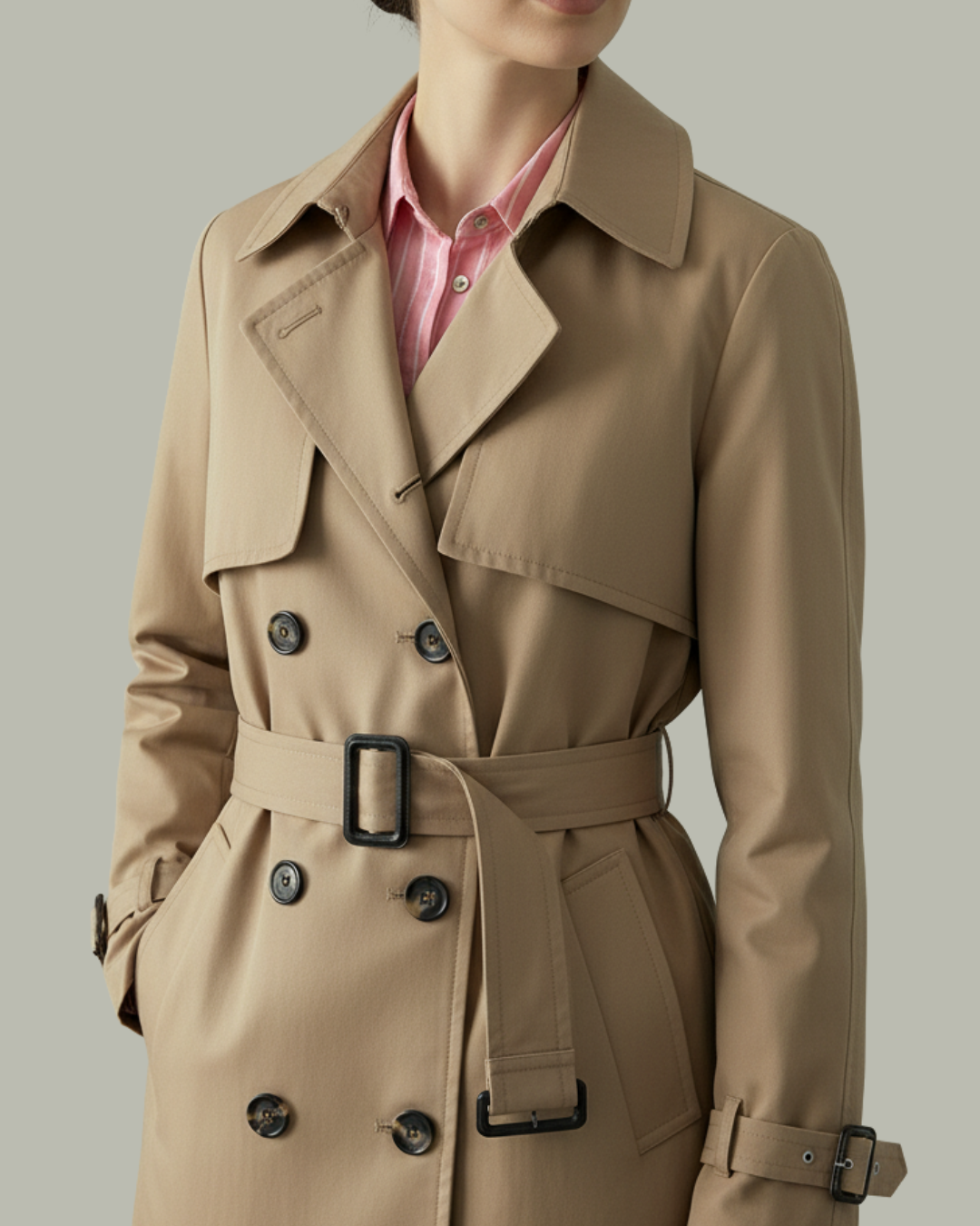 Un clásico imprescindible en cualquier armario: nuestro trench coat atemporal combina elegancia y funcionalidad. Diseñado en color beige, cuenta con doble botonadura, cinturón ajustable que estiliza la figura y dos solapas a cada lado que refuerzan su carácter sofisticado. Su diseño versátil lo convierte en la prenda perfecta para acompañar tanto looks casuales como más formales, temporada tras temporada.